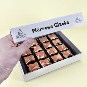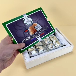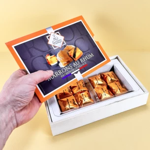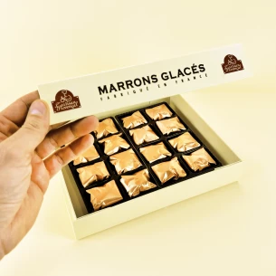 Boîte en métal de collection de 8 marrons glacés 160g. Pliés individuellement sous aluminium doré pour garantir la fraîcheur du produit....
